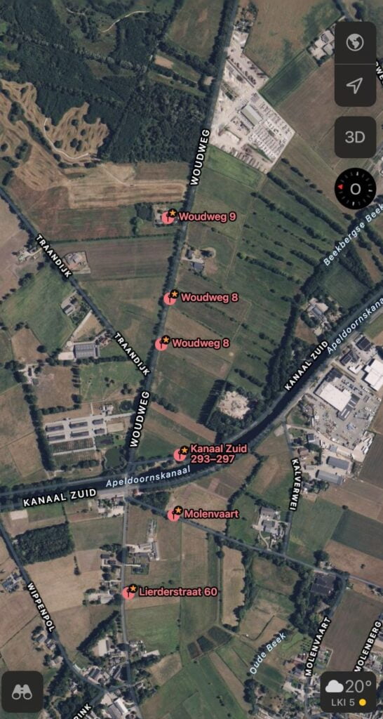 In de afbeeldingen hieronder zijn alle locaties met schade aan gegeven. Startpunt is afbeelding 1 ter hoogte van Konijnenkamp. Laten we beginnen waarom wij vermoeden dat het een jumper is geweest. De eerste drone beelden van het schade pad laten zien dat de tornado vanaf het begin van het maisveld voet aan de grond heeft gezet. Aan de andere kant van het weiland staat een woning waarvan het dak veel te verduren heeft gehad. Wat ons dan ook opvalt, is dat er nadat de tornado zich duidelijk aan de grond heeft gezet, er meerdere plekken zijn in de plaats Beekbergen waar geen schade te zien was. Een omgewaaide boom en geklapt raam en wat dakpannen. Schade vrije/nihile schade plekken van 2 a 300 meter. Dit kan echter ook te maken hebben met multiple vortexen. Echter zien wij daar geen bewijs van terug in het maisveld en overbrugde afstanden lijken ons te groot. (er is wel bewijs verderop in het schade pad). Ook bij afbeelding 2, tussen eerste 2 locaties was er met de drone geen bewijs te vinden in het weiland dat de tornado daar de grond heeft geraakt. Enkel alleen langs de weg wat kleine takjes met blad uit de bomen.